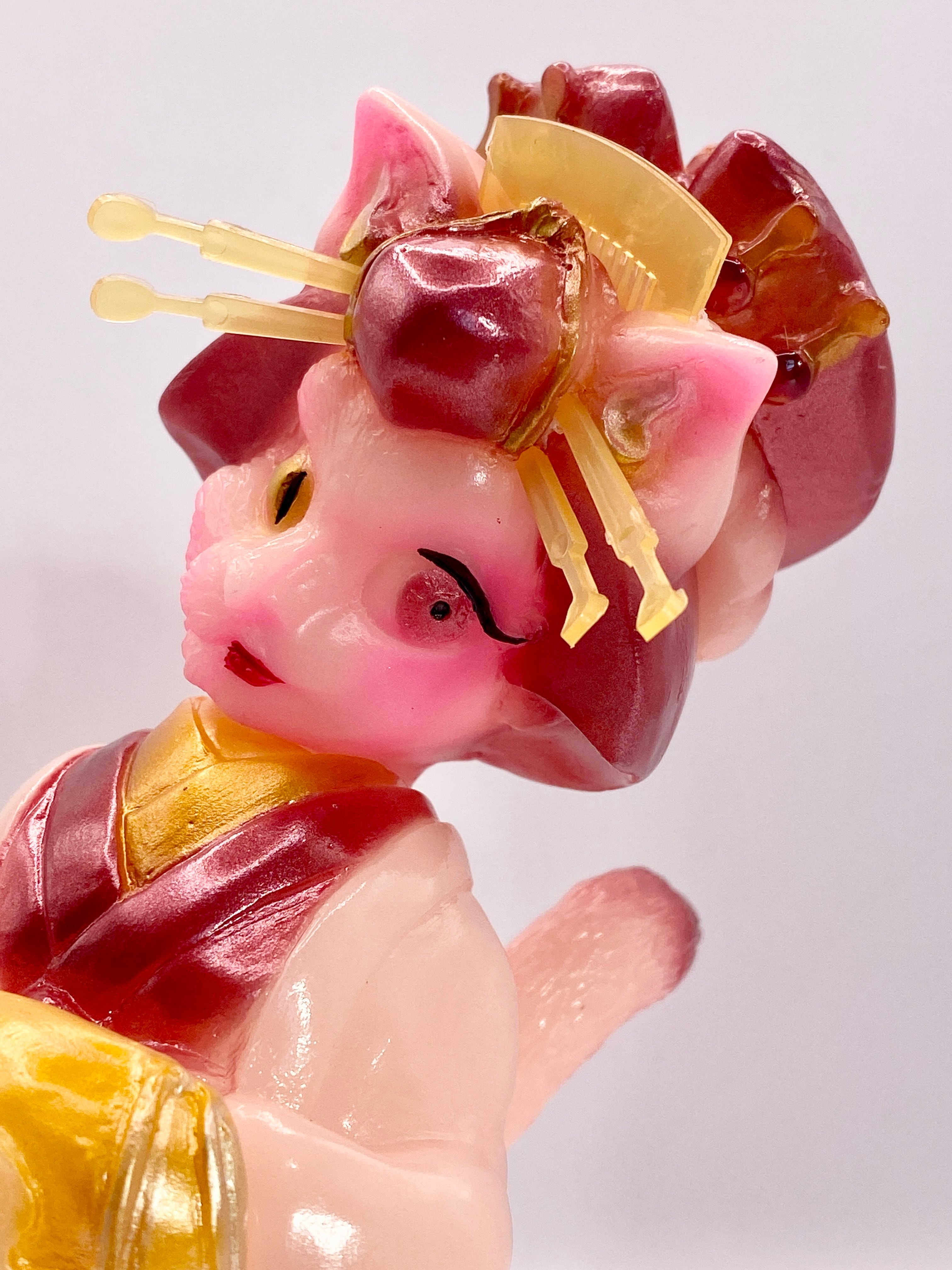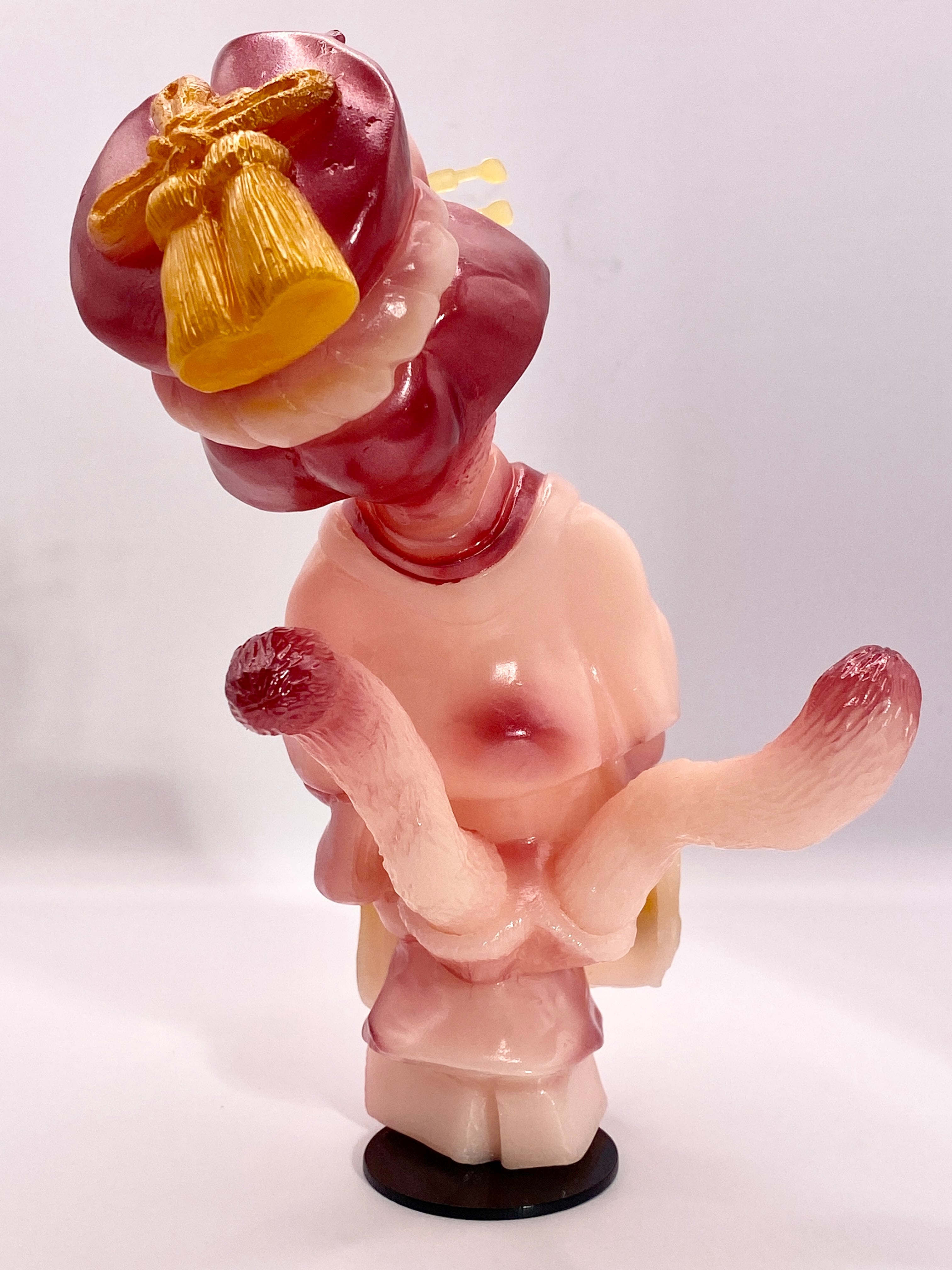 また簪、櫛パーツには日本人形専用のパーツを使用。ソフビの枠を超えた独特の魅力を是非お手元でお楽しみください。